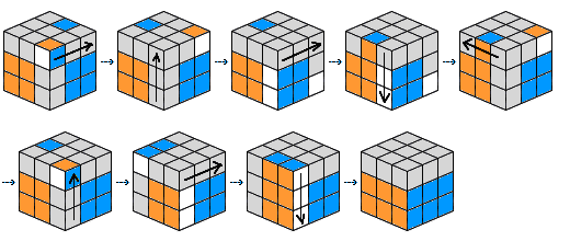 パターン2とよく似ていますが、 エッジキューブの位置がコーナーキューブ白面の反対側にある場合の揃え方です。
