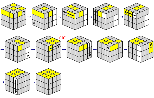 - 最初の4手で右面奥上に白コーナーキューブを1つだけ持ち上げ、上面を180°回転する。