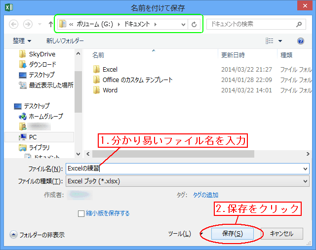 名前を付けて保存ダイアログが出ます(下図)。 ここで確認してもらいたいのは、上部の緑で囲った部分です。 ここにファイルを保存する場所が表示されます。 ここの一番右がドキュメントになっているか確かめて下さい。 これを行なえば、全然違う所に保存してファイルが行方不明になってしまうことを防げます。