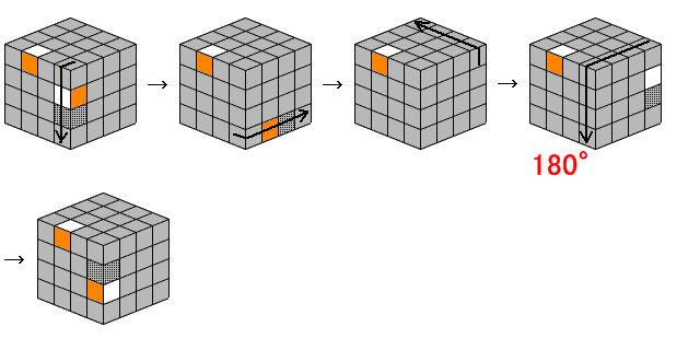 エッジキューブのセットを作る手順は1通りです。この操作を行うことにより、 以下のようにエッジキューブが入れ替わります(3辺が影響することを覚えておいてください)。
